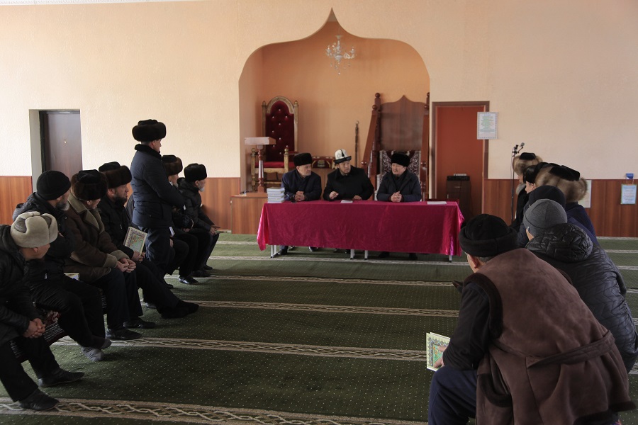 Андан кийин облус казысы райондун борбордук мечитинде имам-хатибдер менен жолугушуп, жыйын өткөрүп, ар бир имамга Куран китептерин белек кылды.