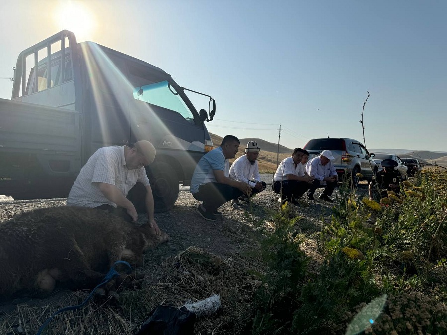 Бүгүн, 29-июль күнү Ош облусуна караштуу Ноокат районунун баш имам-хатиби Бекназар ажы Жапаров жергиликтүү бийлик өкүлдөрү менен биргеликте Ош-Ноокат жолунда мал союп түлөө өткөрүп, эл-журттун амандыгын тилеп дуба кылышты.